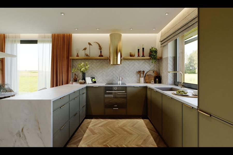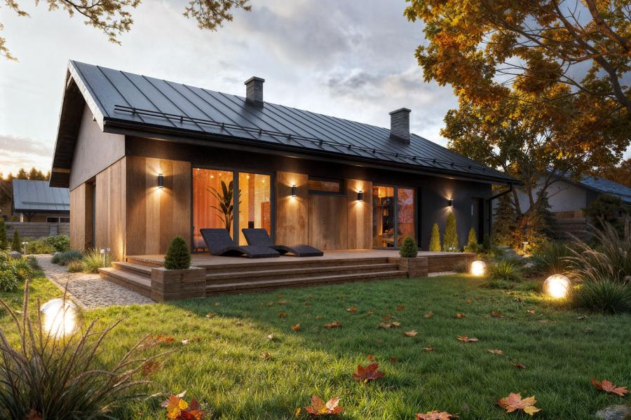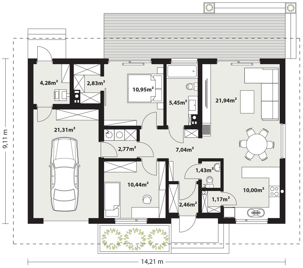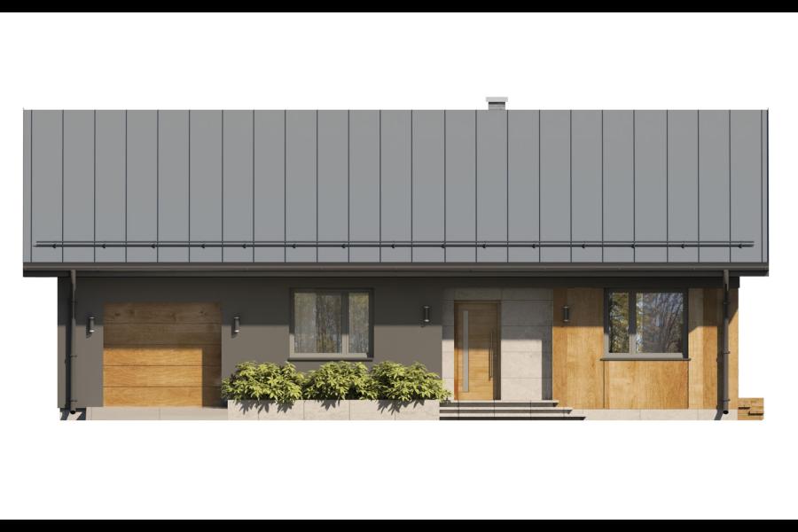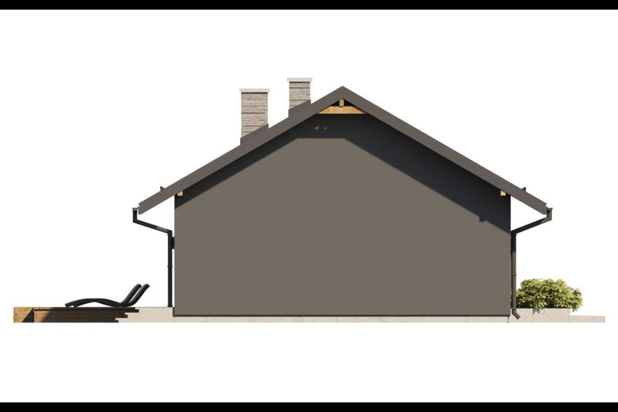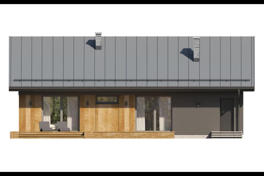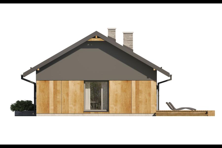 Gaja 4 drewniana to niewielki dom parterowy na rzucie prostokąta przykryty dwuspadowym dachem. Swoim wyglądem zewnętrznym projekt idealnie wpisuje się zarówno w klimat dużych miast, jak i spokojnej wsi. Prostota jego budowy oraz niewielka zwarta bryła przekłada się na niższe koszty budowy oraz na zmniejszenie kosztów późniejszej eksploatacji. Układ funkcjonalny domu został podzielony na 3 strefy. Część dzienną stanowi duża otwarta przestrzeń, w której znajduje się kuchnia, jadalnia, salon oraz wc. Kuchnia wzbogacona została o spiżarnię. W części intymnej znajdują się dwie sypialnie, łazienka oraz przechodnie pomieszczenie gospodarcze, które może pełnić funkcję pralni. Głowna sypialnia posiada własną garderobę. Część gospodarcza domu to garaż i kotłownia. Tak wyraźne podzielenie powierzchni na strefy jest wyjątkowo korzystne w domach o niewielkim metrażu gdzie życie toczy się na jednym poziomie kondygnacji. Atutem projektu jest też możliwość wyjścia na taras z salonu i z głównej sypialni. Gaja 4 drewniana to również dom o bardzo ciekawym wyglądzie zewnętrznych, którego charakter został osiągnięty poprzez współczesne ujęcie architektury. Elewacje zaprojektowano na zasadzie kontrastu, gdzie ciemny antracytowy tynk zestawiono z drewnianym płytami elewacyjnymi. Dzięki tradycyjnej bryle, ale i nowoczesnym elewacjom, Gaja 4 drewniana może się spodobać zarówno inwestorom poszukującym domu bardziej klasycznego, jak i tym otwartym na współczesne spojrzenie na architekturę.