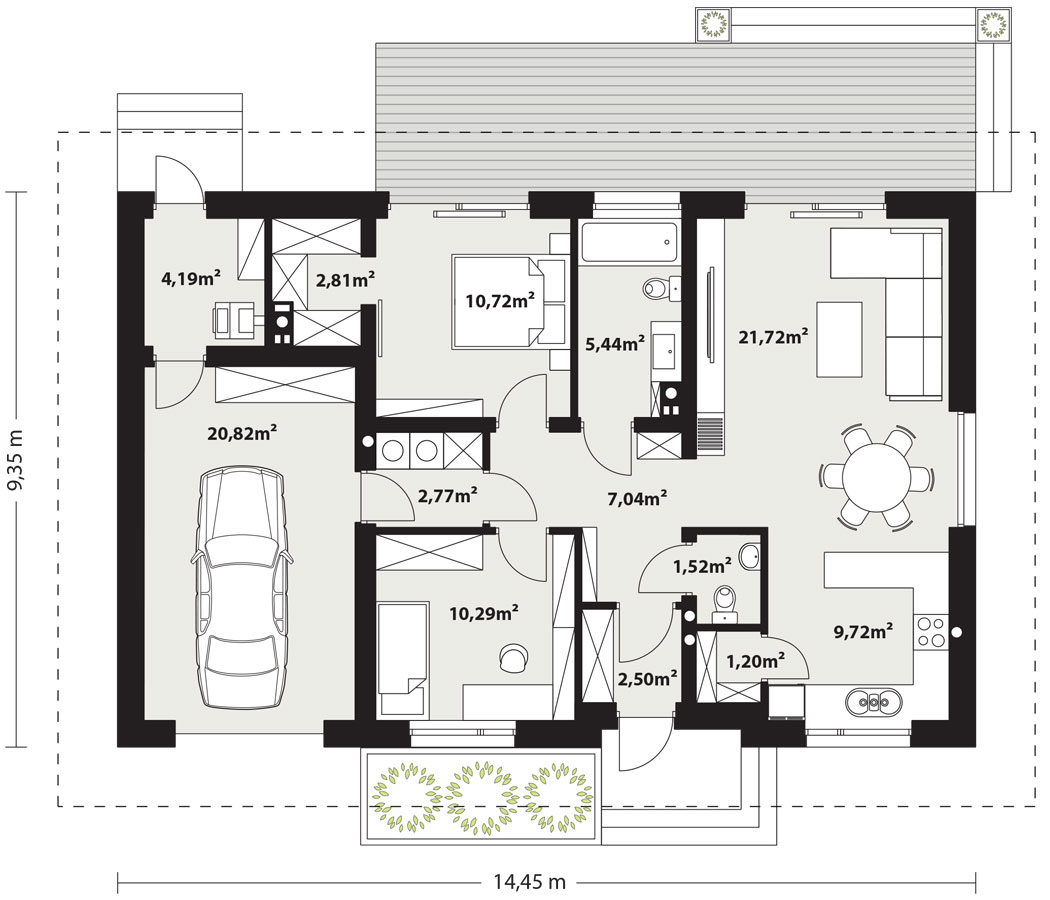 Galia 2 to niewielki dom parterowy na rzucie prostokąta przykryty kopertowym dachem. Swoim wyglądem zewnętrznym projekt idealnie wpisuje się zarówno w klimat dużych miast, jak i spokojnej wsi. Prostota jego budowy oraz niewielka zwarta bryła przekłada się na niższe koszty budowy oraz na zmniejszenie kosztów późniejszej eksploatacji. Układ funkcjonalny domu został podzielony na 3 strefy. Część dzienną stanowi duża otwarta przestrzeń, w której znajduje się kuchnia, jadalnia, salon oraz wc. Kuchnia wzbogacona została o spiżarnię. W części intymnej znajdują się dwie sypialnie, łazienka oraz przechodnie pomieszczenie gospodarcze, które może pełnić funkcję pralni. Głowna sypialnia posiada własną garderobę. Część gospodarcza domu to garaż i kotłownia. Tak wyraźne podzielenie powierzchni na strefy jest wyjątkowo korzystne w domach o niewielkim metrażu gdzie życie toczy się na jednym poziomie kondygnacji. Atutem projektu jest też możliwość wyjścia na taras z salonu i z głównej sypialni. Galia 2 to również dom o bardzo ciekawym wyglądzie zewnętrznym, którego charakter został osiągnięty poprzez współczesne ujęcie architektury. Elewacje zaprojektowano na zasadzie kontrastu, gdzie ciemny antracytowy tynk zestawiono z drewnianym płytami elewacyjnymi. Dzięki tradycyjnej bryle, ale i nowoczesnym elewacjom, Galia 2 może się spodobać zarówno inwestorom poszukującym domu bardziej klasycznego, jak i tym otwartym na współczesne spojrzenie na architekturę.