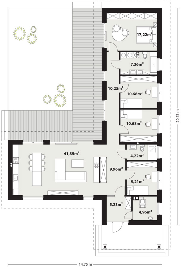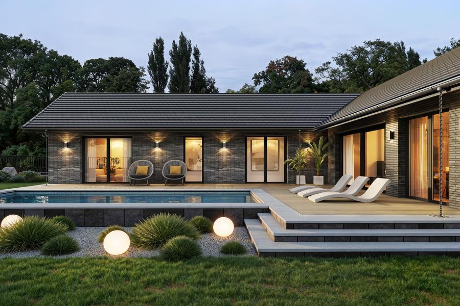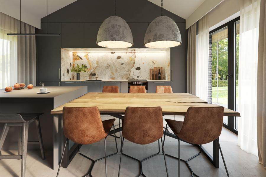 - Integracja z ogrodem – panoramiczne okna i łatwy dostęp do tarasu..