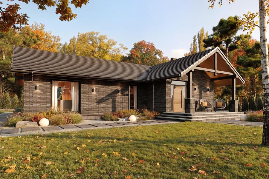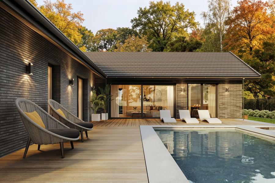 Stella 2 to propozycja dla osób poszukujących parterowego domu, który w mistrzowski sposób łączy tradycyjną solidność z nowoczesnym podejściem do architektury. Wyjątkowość tego projektu drzemie w jego formie – budynek tworzą dwie przenikające się bryły, które w sposób naturalny i czytelny wydzielają strefę dzienną (wspólną) oraz nocną (prywatną). Taki układ nie tylko zapewnia domownikom maksimum intymności, ale także pozwolił na wykreowanie dużego, zacisznego ogrodu z tarasem, który staje się naturalnym przedłużeniem salonu i sypialni.