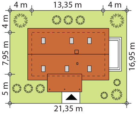 | Wysokość kalenicyMaksymalna wysokość budynku mierzona od poziomu terenu przy wejściu do najwyżej położonego punktu dachu. | 7.5 m |