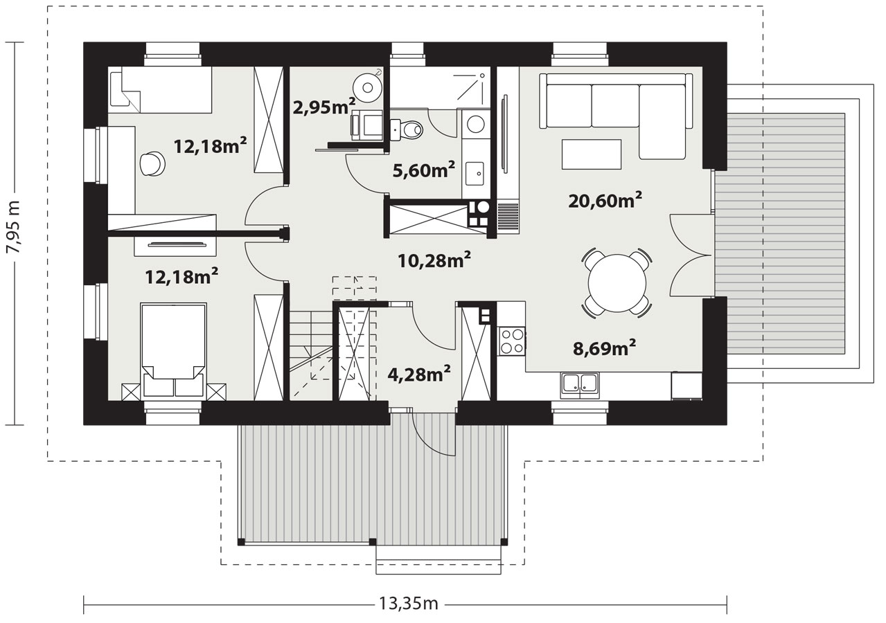 | Powierzchnia zabudowyPowierzchnia terenu, zajęta przez budynek w stanie wykończonym, bez tarasów, schodów zewnętrznych i podjazdów (PN-ISO 9836: 1997) | 106.13 m² |